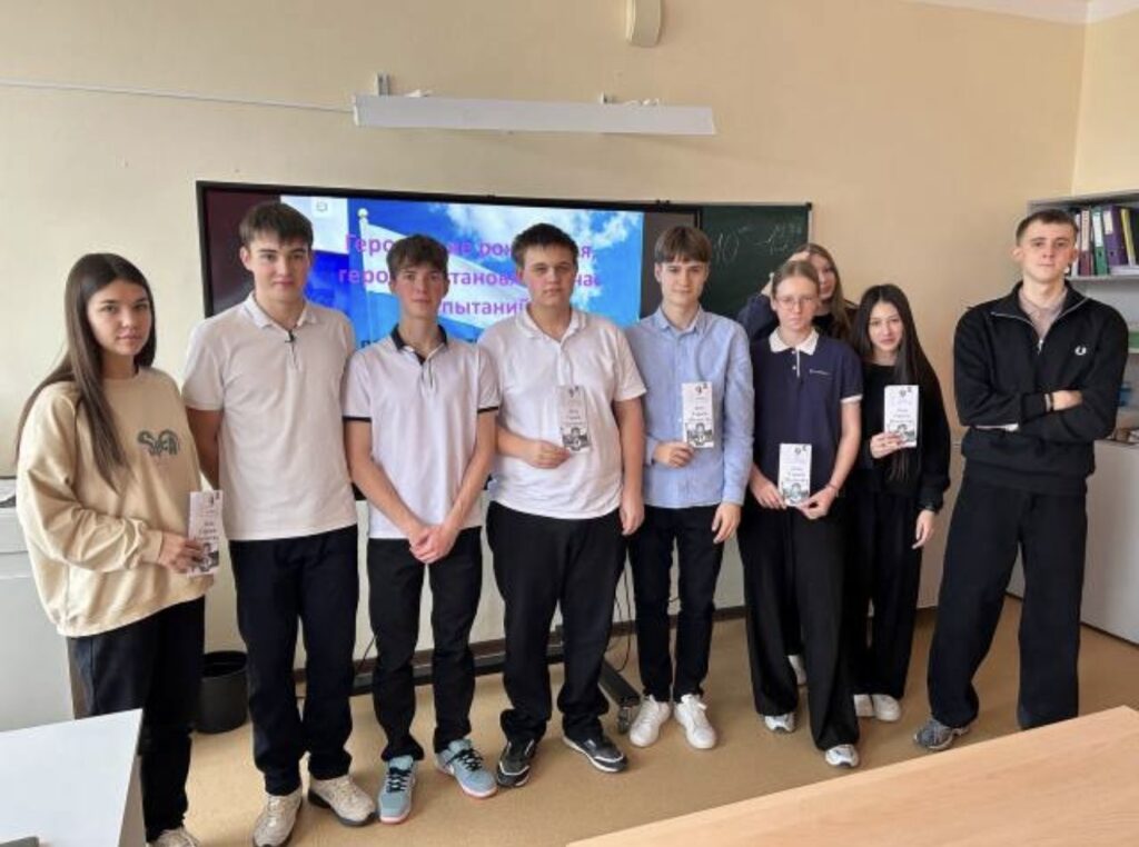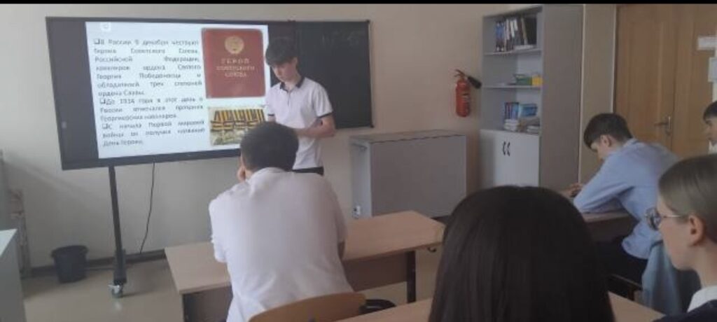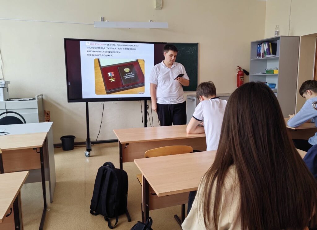 В день чествования героев России учащиеся 10 класса подготовили классный час на тему «Героями не рождаются, а становятся в час испытаний». Совместно с классным руководителем учащиеся подготовили информацию об истории праздника, о заслугах людей перед отечеством, а также проговорили о том, какими качествами обладает каждый герой. В конце мероприятия ученики получили буклеты, в которых содержится ключевая информация о празднике.