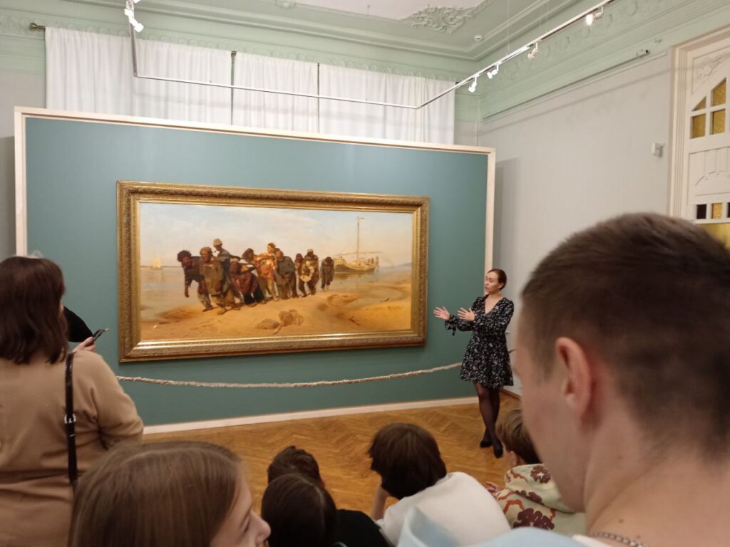 Во время экскурсии ребята смогли пройти тем же художественным маршрутом, что и сам Илья Ефимович: от первых замыслов, возникших в 1869 году, до момента, когда в 1873 году полотно приобрёл великий князь Владимир.